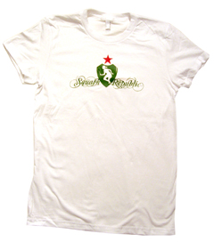 Short sleeve cotton t-shirt with a two colour (red & green) logo on front.