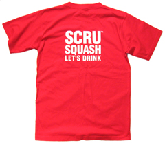 Short sleeve cotton t-shirt with a one colour (white) "S.C.R.U. Squash" logo on front with one colour (white) slogan on back.
